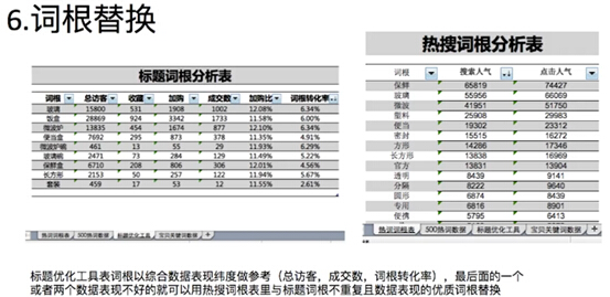 备选词根表和标题词根表都准备好了,接下来就是词根替换,把表现不好的词根去掉。标题优化工具表的词根需要以综合数据表现维度做参考,就是以总访客、成交数、词根转化率为参考,而不是以单一的数据维度作为筛选标准。对比完成后,把最后一个或者两个数据表现不好的,用热搜词根表里与标题词根不重复并且数据表现好的优质词根替换。注意,标题词根分析表里有一些特殊词或者必须保留的词,大家按照天猫代运营的做法,不要直接删除掉,比如一个新品牌,运营端需要主推品牌,这个时候即使这个品牌词表现得并不好,也不能直接删掉;以及一些根本得属性词,表现不好也不能删除。表格里有两个词表现并不好,一个是套装一个是微波炉碗,这两个词不是根本属性词,也没有代表品牌等特殊含义不可删除得词,那么就把这两个词替换掉。