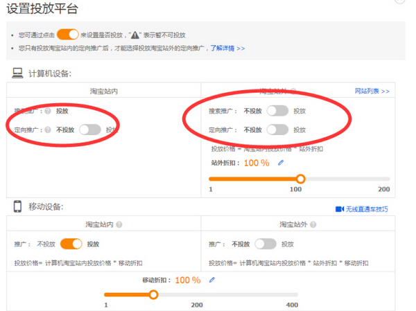 1.批量添加大量关键词(最好加满),无线端出价0.3左右,PC端出价0.01,关闭站外。